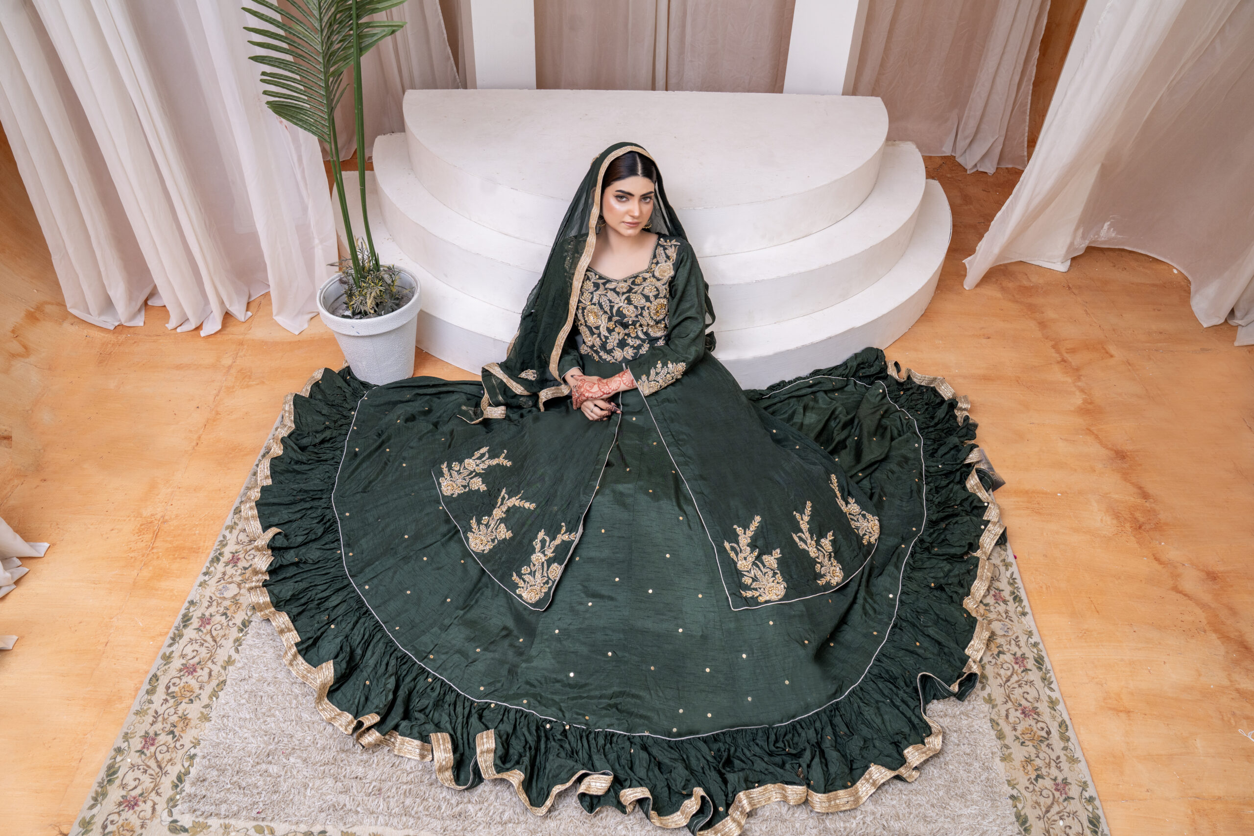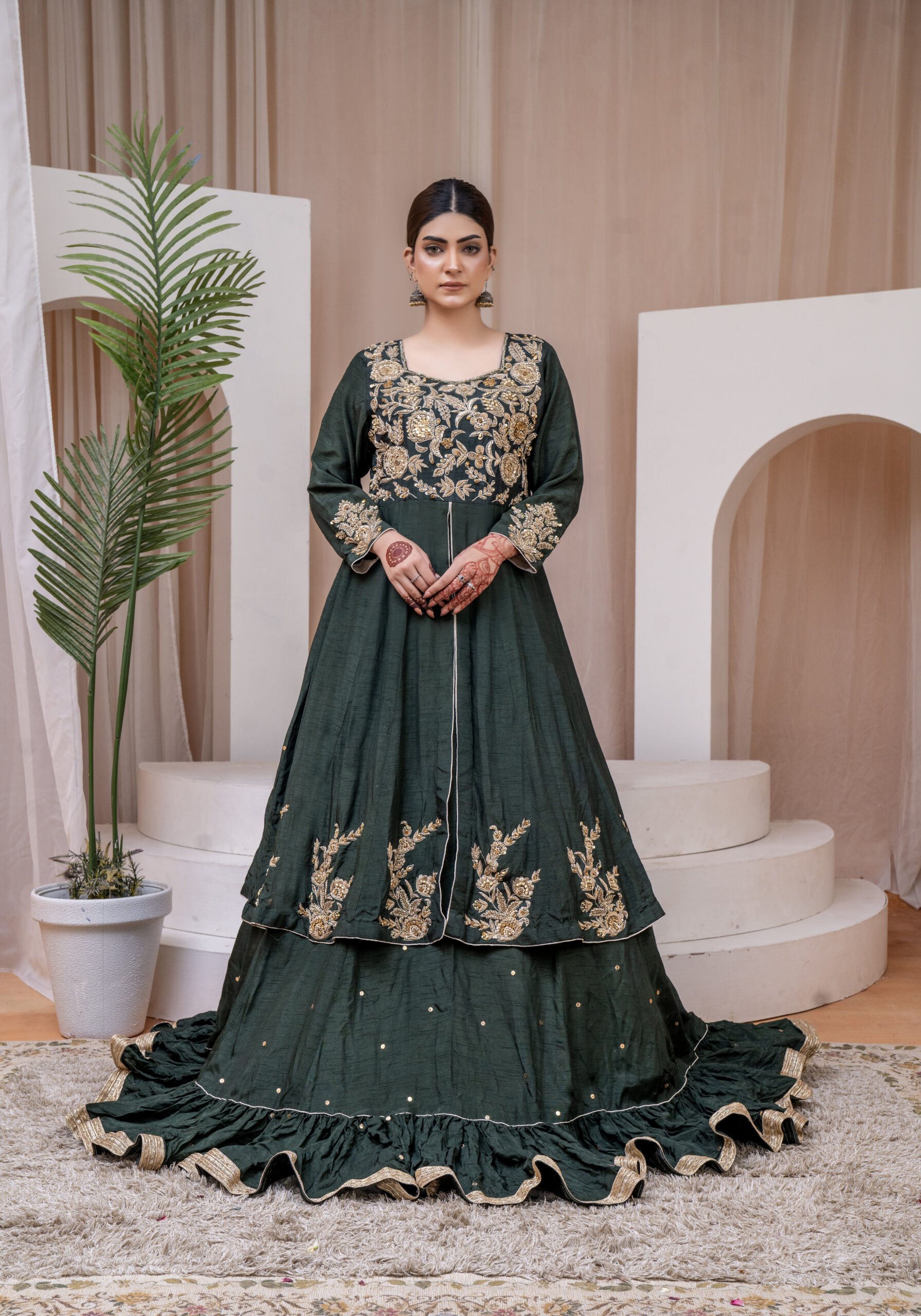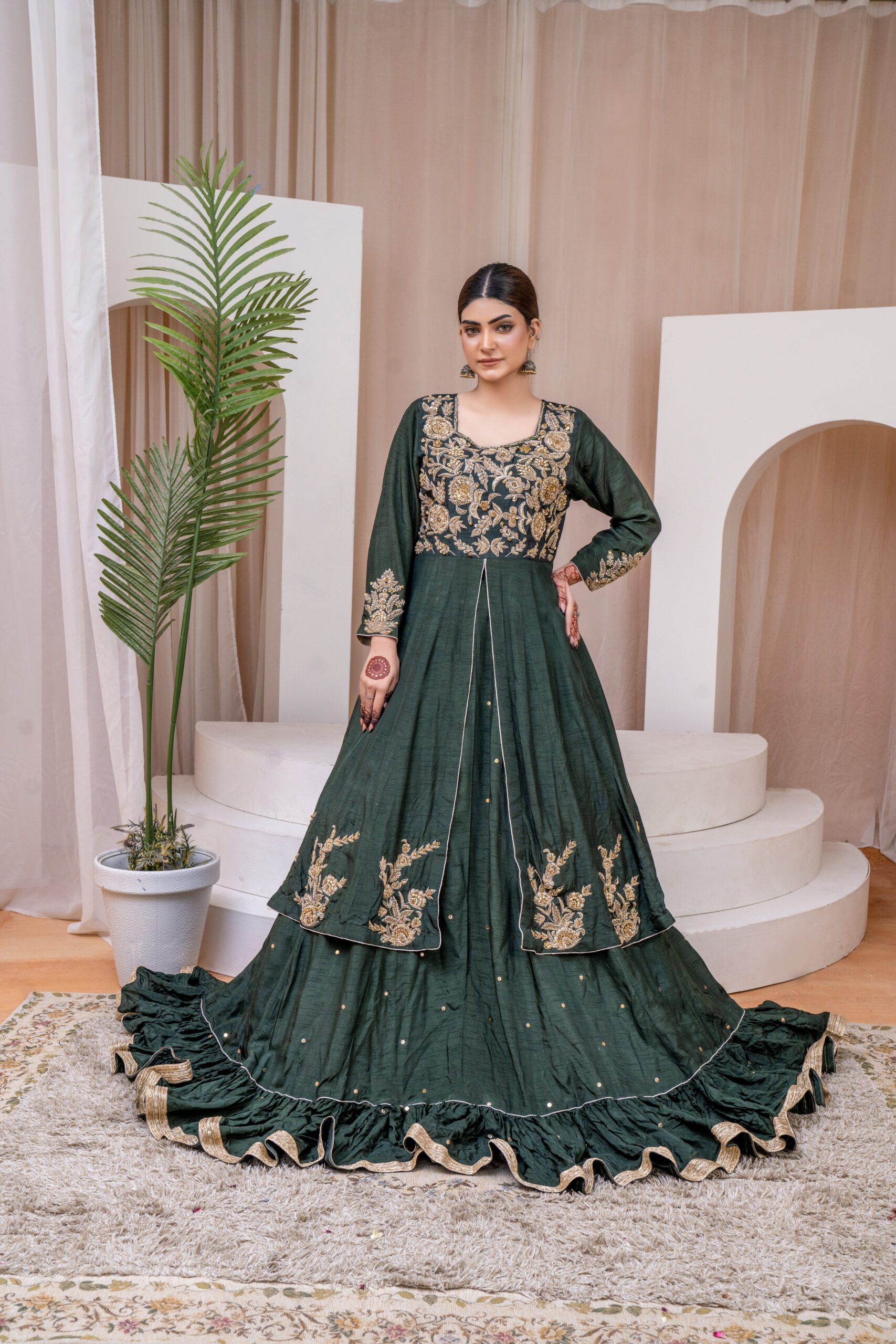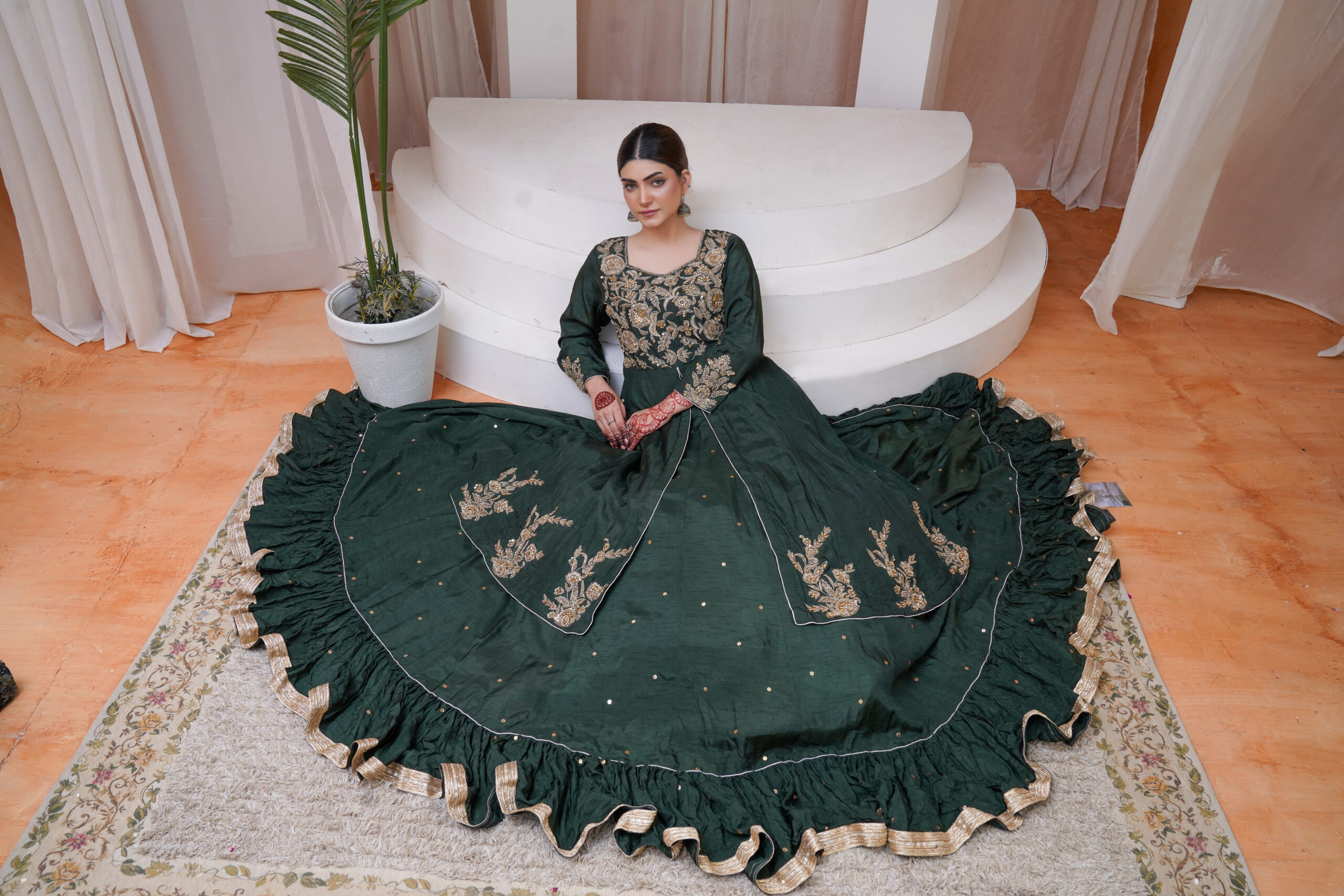 Emerald Green Embroidered Anarkali Gown with Ruffle Hem