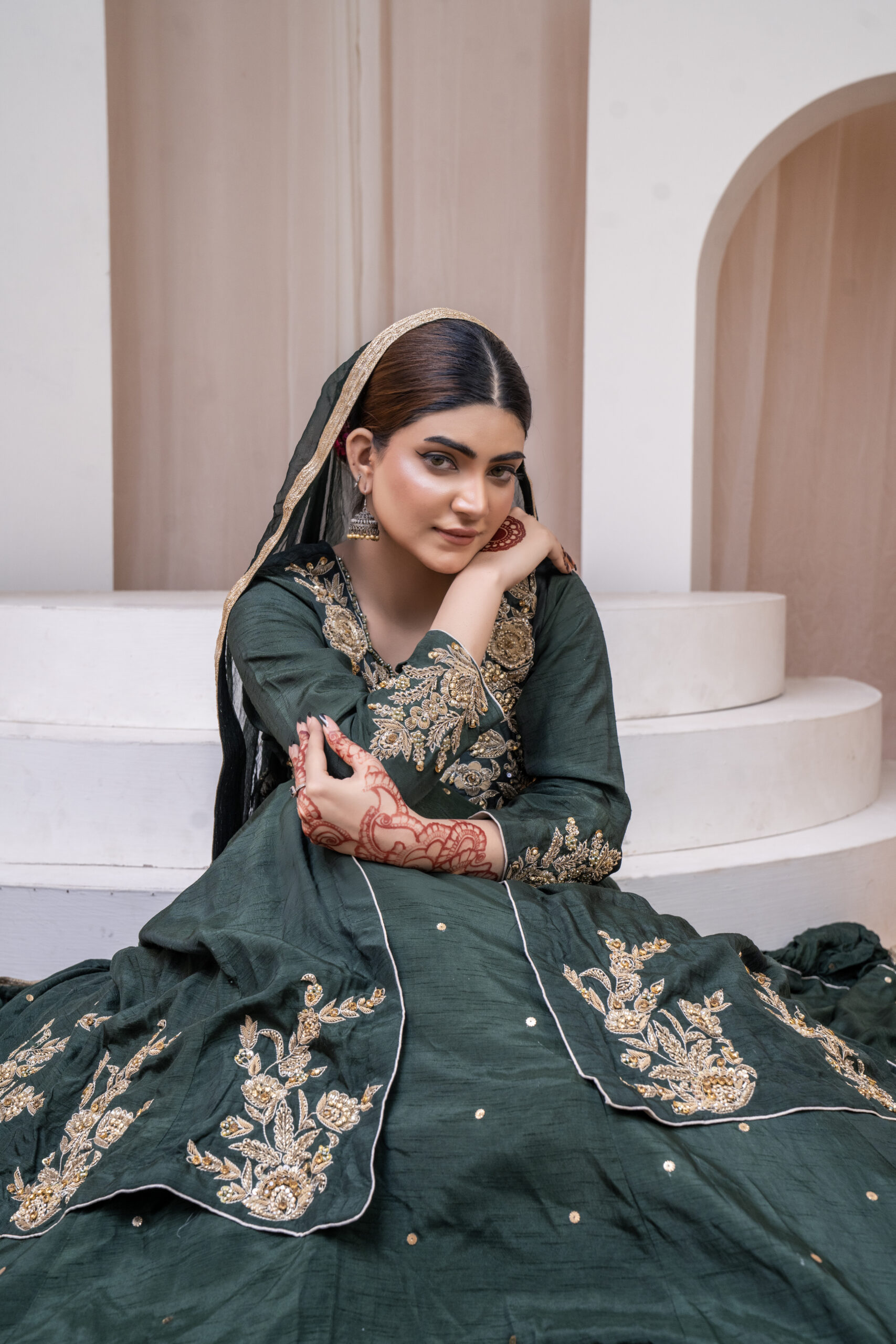 Drape yourself in elegance with this emerald green Anarkali gown, designed for the modern woman who loves traditional charm. Crafted from premium silk-blend fabric, this floor-length outfit features intricate golden thread and sequin embroidery on the bodice and sleeves, beautifully contrasted by delicate scattered embellishments along the flared skirt.