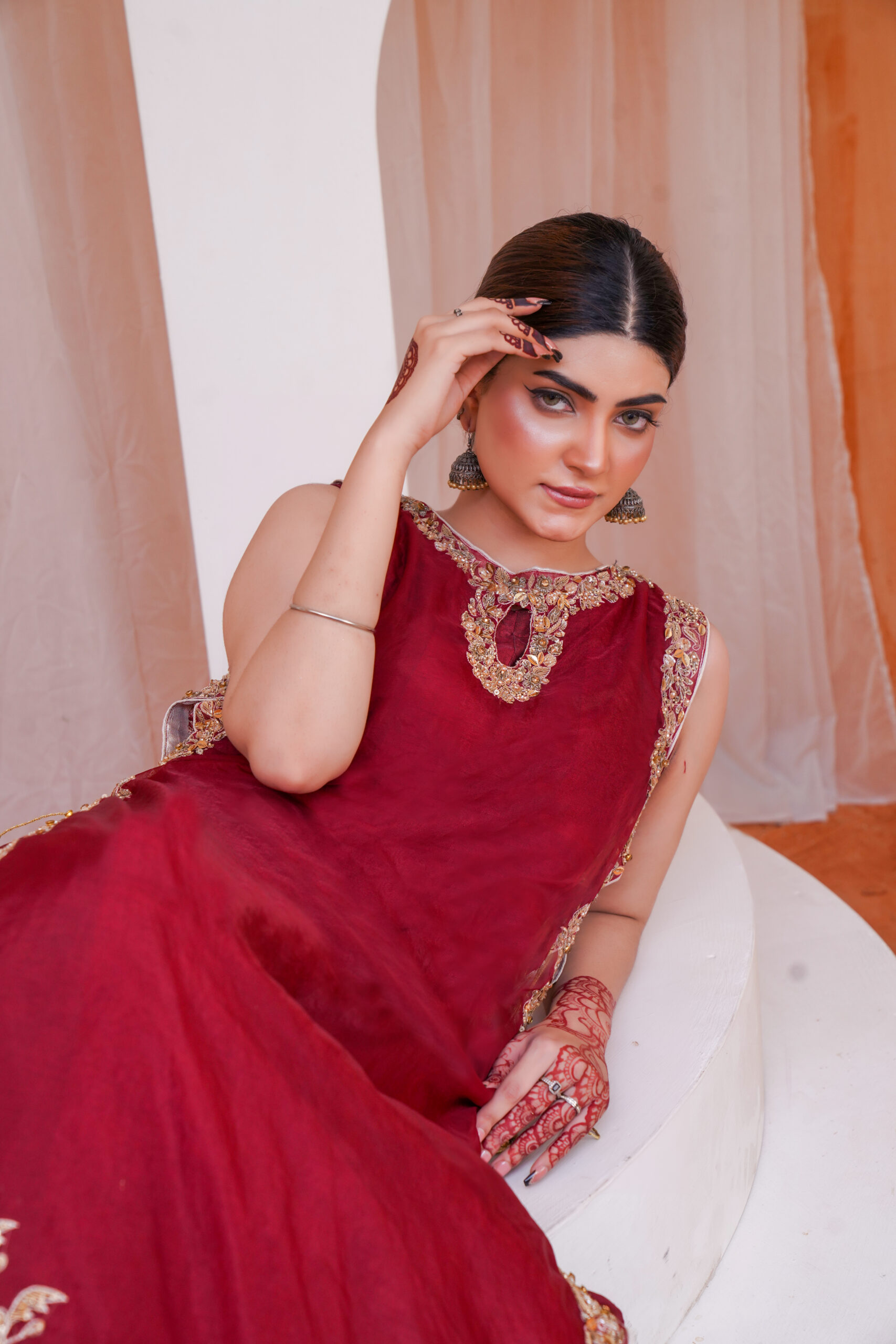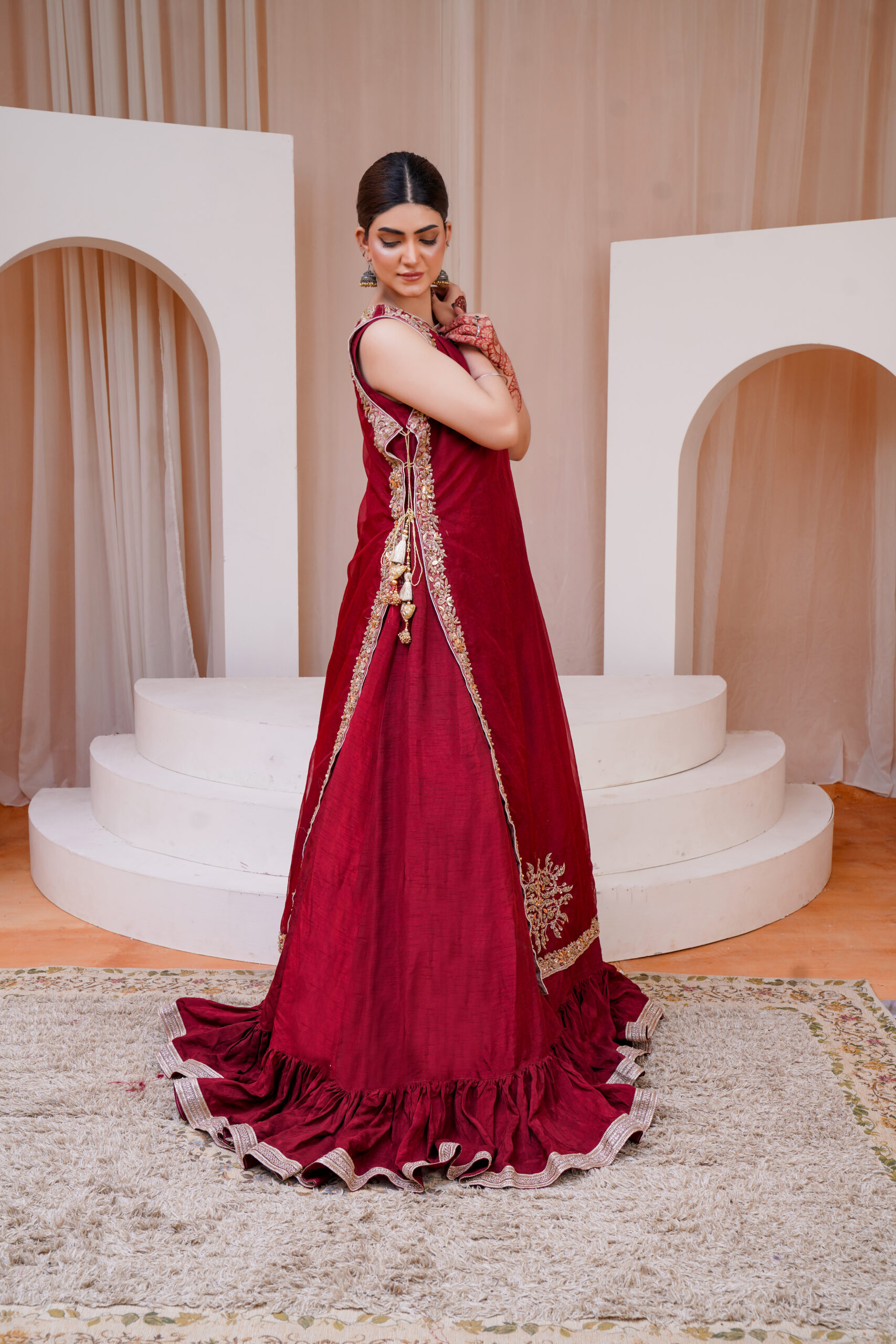 This maroon embroidered gown is designed for the modern woman who cherishes traditional artistry. The regal color, intricate embellishments, and statement-making hemline make it a showstopper at any celebration.