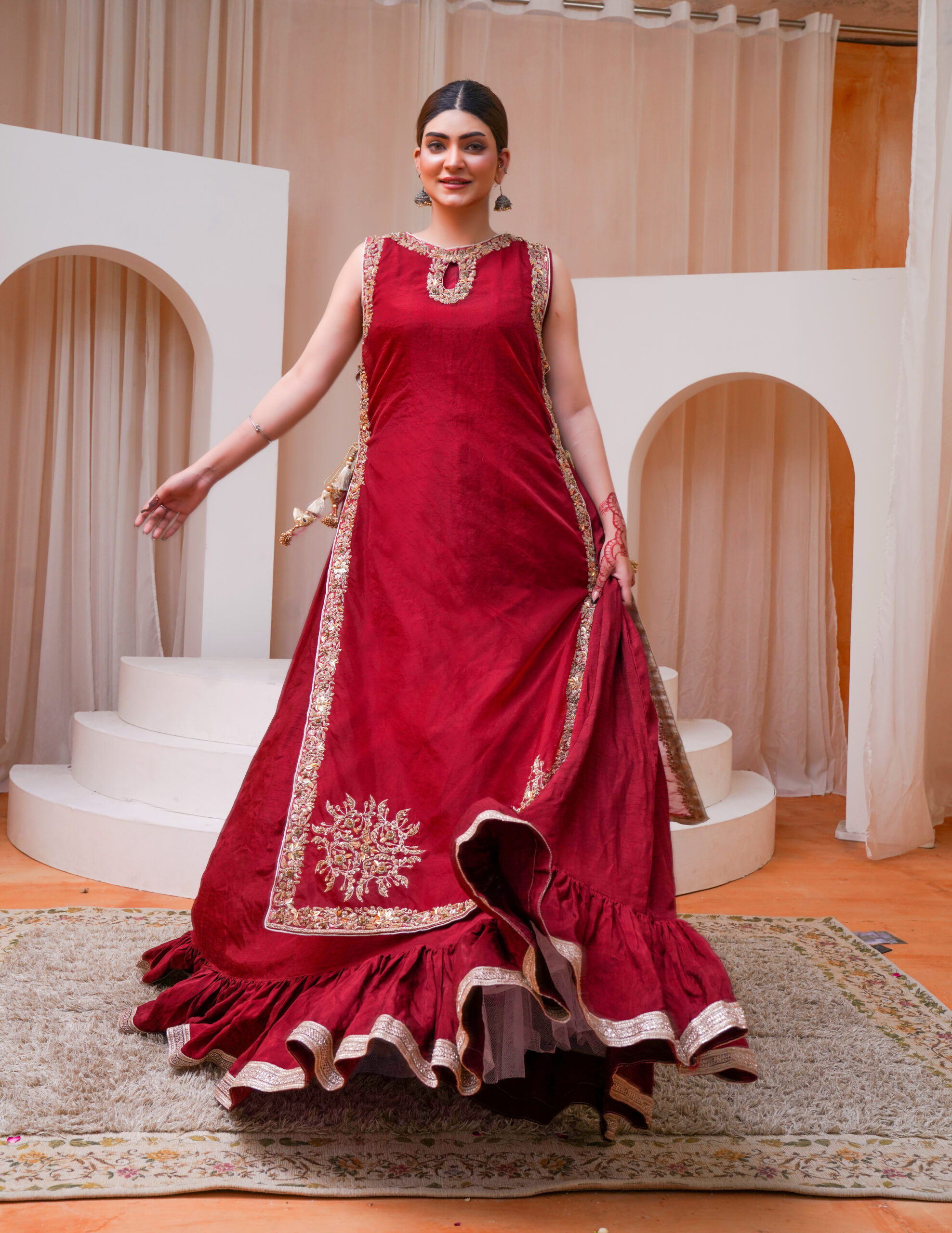 Elevate your ethnic wardrobe with our Maroon Embroidered Floor-Length Gown, a masterpiece of regal elegance and timeless design. Crafted in a rich maroon fabric, this sleeveless gown features intricate golden embroidery along the neckline, side panels, and hem, with ornate motifs adding a royal touch to the lower front. The delicate sequin and zari work enhance its luxurious appeal, while the voluminous ruffled hemline with golden edging creates a dramatic, graceful silhouette.
